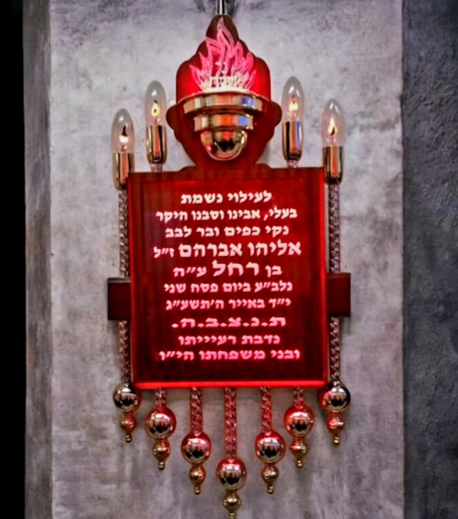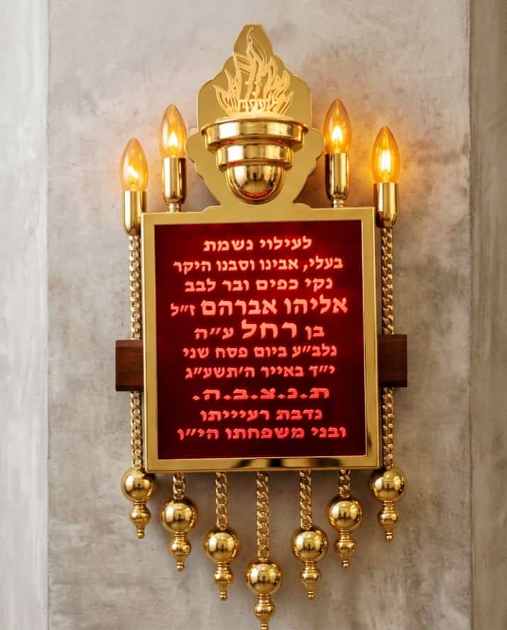 שלט זיכרון לבית כנסת, בסיס מעץ מהגוני, נר נשמה מצופה זהב עם להבות, שלט חריטת לייזר מואר בלדים 12V לבטיחות וחיסכון בחשמל, כדורים ציפוי זהב.