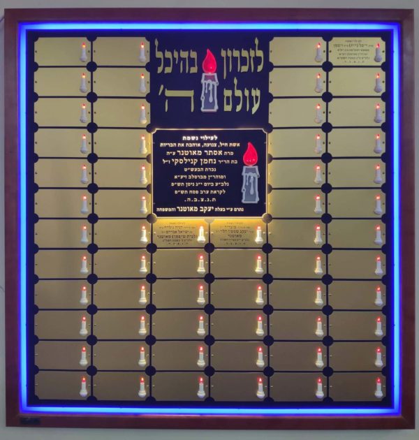 לוח זיכרון והנצחה 60 לוחיות + לוחית הנצחה ראשית מוארת בלדים, רקע שחור לוחיות אלומיניום זהב עם נר ומפסק לכל לוחית + מסגרת עץ +תאורת לדים מסביב