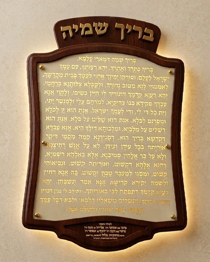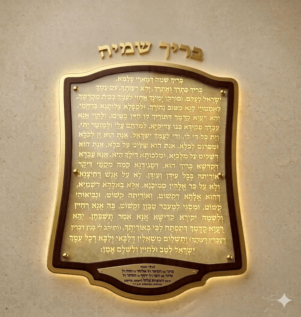 הוסיפו פאר וקדושה לפתיחת ההיכל עם לוח "בריך שמיה" בעיצוב יוקרתי ומוקפד.