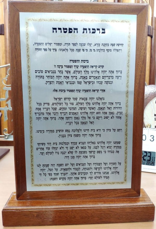 ברכות תורה והפטרה דו צדדי נייד, בסיס מעץ פורניר מהגוני + שלט מסובלימציה כסף, + ברכת הפטרה מאחור