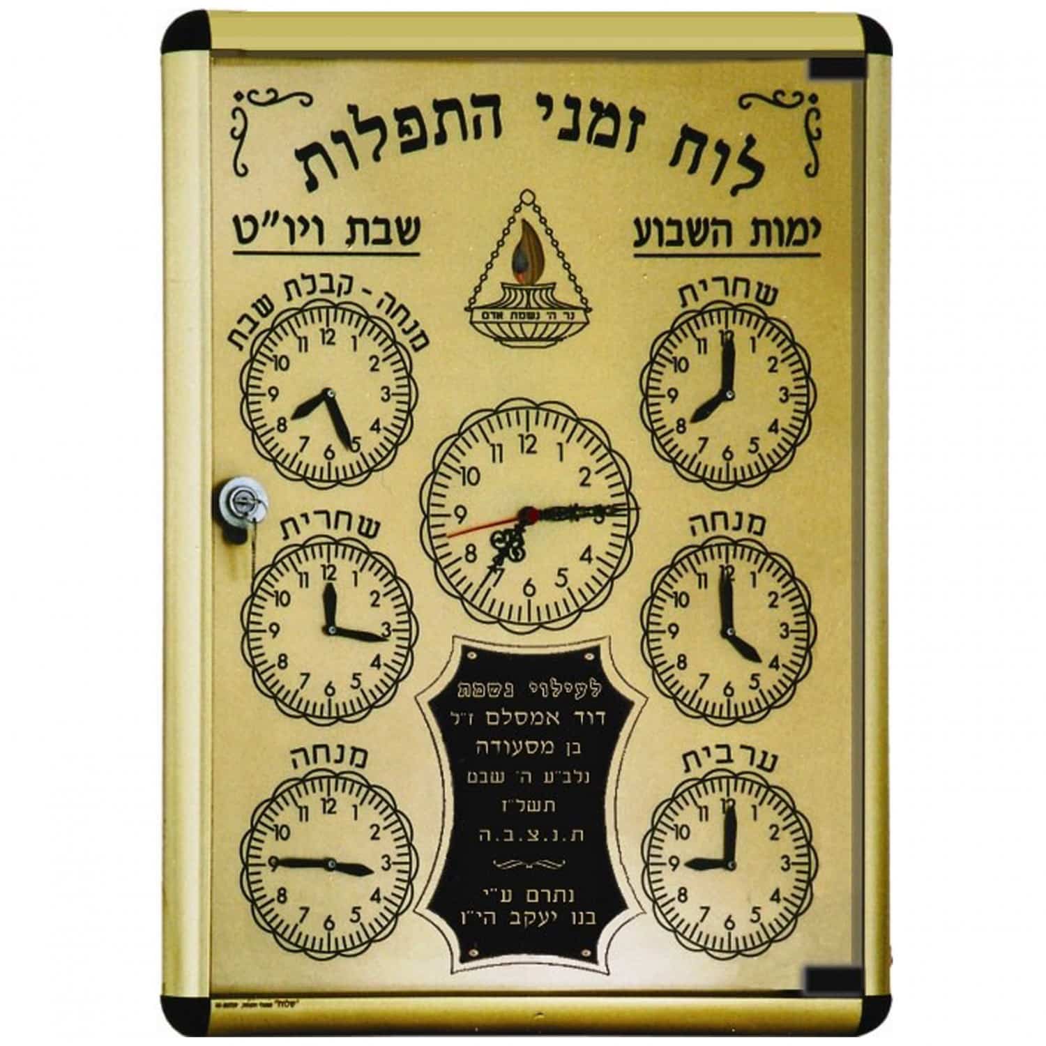 לוח זמני תפילות, רקע מפרספקס זהב חריטה בשחור, עם שעונים ומחוגים הניתנים לכיוון שעת התפילה, עם דלת פרספקס שקוף לנעילה.
