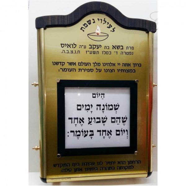לוח ספירת העומר מפרספקס זהב +חריטה +כותרת מהגוני +נר מהבהב פנימי, + ספירת העומר על גלגל מודפס על חומר גמיש ודק, בתוך מסגרת קרניז פורניר מהגוני, + מודים נשלף רקע זהב על פח שחור +מגנטים לכיסוי ספירת העומר.